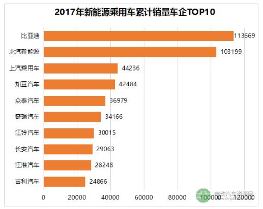 從車企表現(xiàn)看,2017年新能源乘用車?yán)塾嬩N量突破十萬臺的車企有兩家,其中比亞迪累計銷售113669,占比20.43%,奪得冠軍;北汽新能源累計銷售103199臺,占比18.55%奪得亞軍。