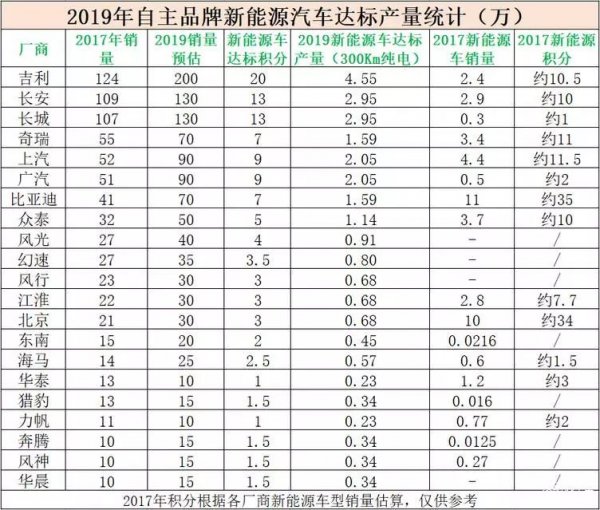 按照辦法要求,綜合各廠商2019年預估銷量,國家標準以及2017年各廠商新能源汽車銷量(含純電、插電),得出如下表格。