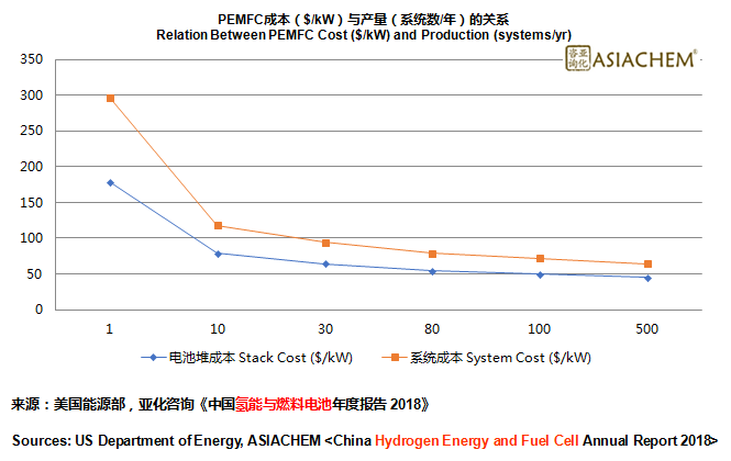 質(zhì)子交換膜燃料電池的單電池主要由雙極板和膜電極組成,膜電極主要由氣體擴(kuò)散層、催化層和質(zhì)子交換膜組成。單電池需要由堆棧的方式構(gòu)成電池電堆,電堆的兩側(cè)需要端板、絕緣板以及集流板等結(jié)構(gòu)裝配,起固定、絕緣以及收集電流的作用。美國(guó)能源部最新數(shù)據(jù)顯示,以80kW質(zhì)子交換膜燃料電池系統(tǒng)為例,2017年,每生產(chǎn)1000套燃料電池,燃料電池系統(tǒng)(包括燃料電池電堆、高壓儲(chǔ)氫罐、升壓變頻器、電動(dòng)機(jī)、動(dòng)力控制單元等)成本為179美元/kW,其中電堆成本為118美元/kW;每生產(chǎn)1萬(wàn)套燃料電池,燃料電池系統(tǒng)成本為79美元/kW,其中電堆成本為39美元/kW。