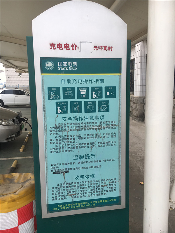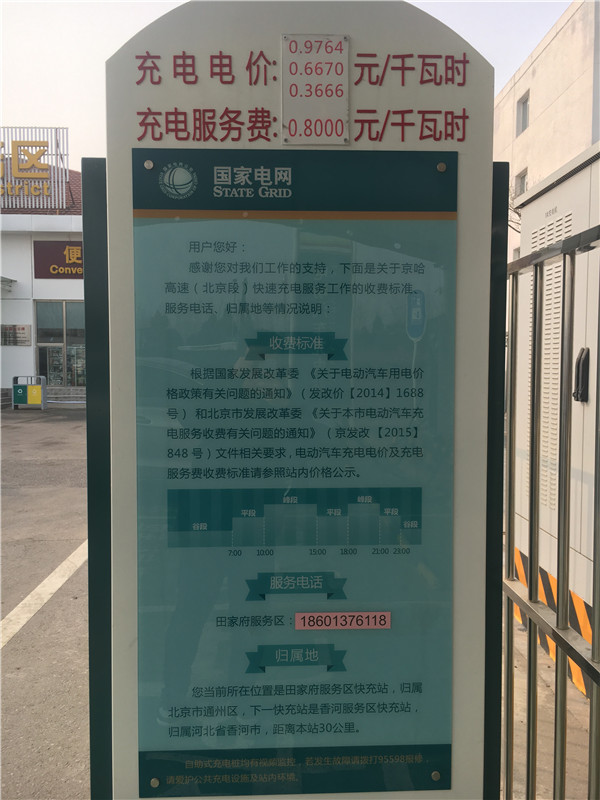首先,在出京方向的香河服務(wù)區(qū),標(biāo)牌被劃的破爛不堪,甚至沒有明顯的電價收費和預(yù)留電話,記者在充電設(shè)備上找到咨詢電話后致電,對方解釋是因為服務(wù)商政府等原因,電價沒有最終確定下來,只能按照現(xiàn)行的價格收費,所以未在標(biāo)牌上標(biāo)明。