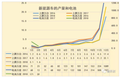 根據崔東樹個人測算,18年新能源車銷售數量實現開門紅,2月新能源車銷量1 6萬臺,同比增長4倍,電池用量59萬度,同比增長3 5倍。17年的新能
