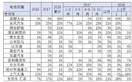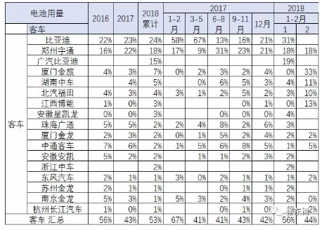 2018年1到2月份,客商廠家對電池的需求相對較強,其中比亞迪表現特別突出,2018年1到2月份,比亞迪課程電池容量達到整個客車電池用量的24%,而廣汽比亞迪的客車車電池用量達到15%,廈門金旅和福建金盛,福建中車等,表現也較好,而其他傳統(tǒng)客車企業(yè)的2018年電池需求并不是很強,,比亞迪的鋰電池占比達到整個客車電池用量的50%,