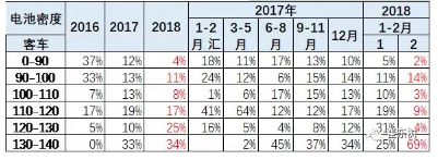 2018年課程產品的電池能量密度提升特別明顯,1到2月份的,120到138每千克的占比達到25%,較前期提升較大130到140瓦時,每千克的高能量電池的占比也達到34%,表現特別強低能量密度的電池在今年表現特別差,