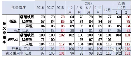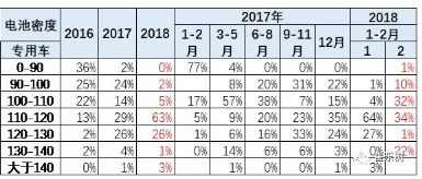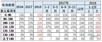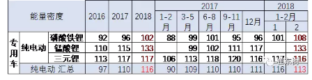 2018年1-2月份用車的電池的能量密度按照116瓦每千克,較2017年的118每千克,小幅提升,找原因是因為磷酸鐵鋰的電池能量密度有所改善,而三元里的能量密度提升并不很明顯。
