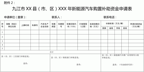 2. 九江市XX縣(市、區(qū))XXX年新能源汽車購(gòu)置補(bǔ)助資金申請(qǐng)表;