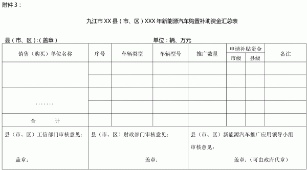 3. 九江市XX縣(市、區(qū))XXX年新能源汽車購(gòu)置補(bǔ)助資金匯總表;