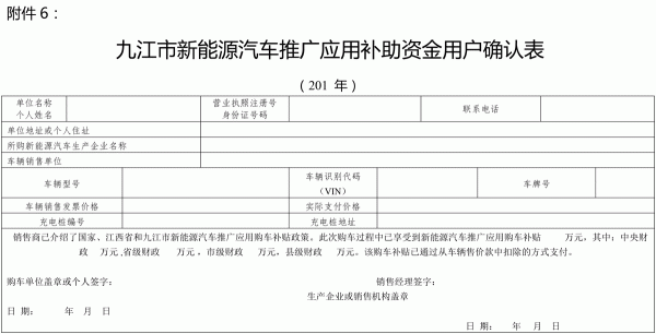6. 九江市新能源汽車推廣應(yīng)用補(bǔ)助資金用戶確認(rèn)表。