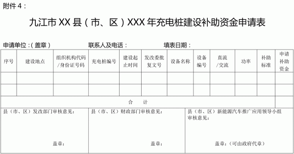 4. 九江市XX縣(市、區(qū))XXX年充電樁建設(shè)補(bǔ)助資金申請(qǐng)表;