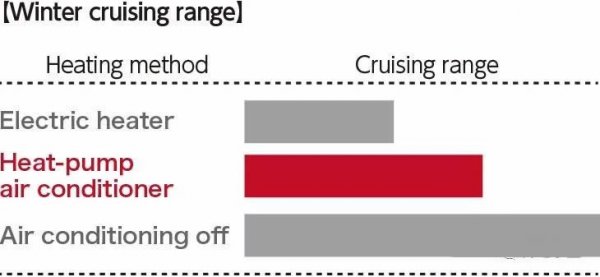 要引入熱泵系統(tǒng)其最主要的動因就是純電動汽車或者支持純電行駛的插電式混動汽車不能再繼續(xù)使用發(fā)動機(jī)作為穩(wěn)定的熱源用于制熱。因此在引入熱泵系統(tǒng)之前,電動汽車的空調(diào)系統(tǒng)制熱功能主要由電加熱器,又稱電阻PTC(Positive Temperature Coefficient)加熱器完成。而要知道直接用電加熱得到的熱量會大大降低電池的電量和行駛里程。如下圖所示根據(jù)統(tǒng)計(jì),當(dāng)冬季行駛打開基于電加熱的空調(diào)制熱功能時(shí),幾乎一半的電量都用于制熱。而僅剩一半的電量用于行駛。而使用熱泵系統(tǒng)制熱則行駛里程大幅提升。