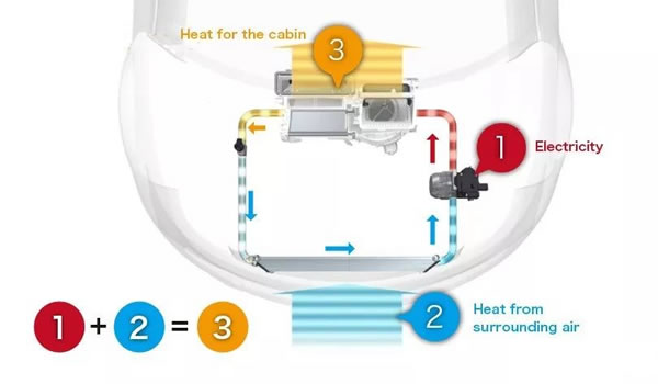 那么熱泵系統(tǒng)到底要怎樣才能被應(yīng)用到汽車空調(diào)系統(tǒng)中呢?如下圖所示,熱泵系統(tǒng)就是通過電動壓縮機(jī)1將外部環(huán)境溫度中的熱量2吸取并輸送到車廂內(nèi)3進(jìn)行制熱的過程。