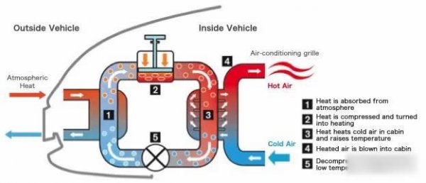 具體的過程如下圖所示,1.熱量從環(huán)境中被吸取進(jìn)熱泵系統(tǒng),2.熱量被壓縮并被加熱,3.熱量被用來加熱車廂內(nèi)的冷空氣并使其升溫,4.加熱后的空氣被送入車廂內(nèi),5.減壓后的熱量被轉(zhuǎn)化成低溫?zé)崃颗懦鲕囃狻岜孟到y(tǒng)需要兼顧制熱和制冷兩種工況。制冷模式下的車內(nèi)蒸發(fā)器在制熱模式下用作冷凝器,相應(yīng)的制冷模式下的車外冷凝器在制熱模式下用作蒸發(fā)器。
