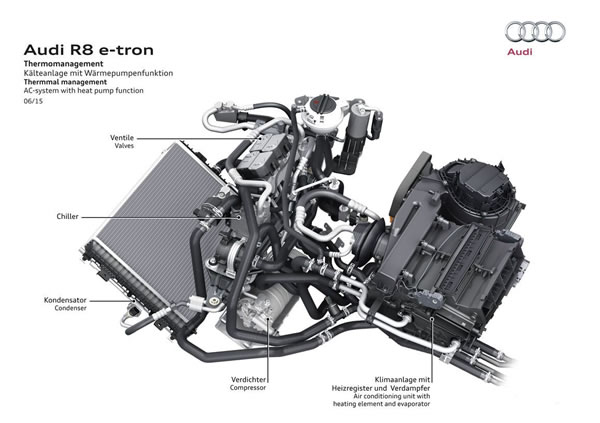 那么現(xiàn)在都有哪些電動車型使用了熱泵系統(tǒng)呢?大眾e-Golf高爾夫純電動版在美國市場可以加裝的熱泵空調(diào)系統(tǒng)。下圖為奧迪R8 e-tron純電動版所使用的熱泵空調(diào)系統(tǒng)。同時(shí)寶馬稱其i3電動汽車也使用了熱泵空調(diào)系統(tǒng)。