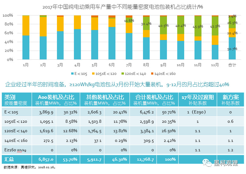 從上面的圖表可以看到,2017年電池包能量密度在105Wh/kg以下的車輛的鋰電裝機(jī)占比高達(dá)50.7%,超過了一半,如果新政在2017年實(shí)施的話,這部分裝機(jī)量對應(yīng)的車輛是無法獲得一分錢補(bǔ)貼的;而能夠獲得基礎(chǔ)系數(shù)1以上的占比也只有28.92%。鮮明體現(xiàn)了新政在能量密度方面的大躍進(jìn)。雖然從月份進(jìn)展來看,去年后4個月的裝機(jī)表現(xiàn)使得新政的推出也有它的合理性,但是,后4個月的車輛目前為止并沒有多少上路的實(shí)證數(shù)據(jù),安全系數(shù)是否足夠尚未可知,這種情況下就迫不及待進(jìn)一步大幅提升能量密度要求,可能欠妥。