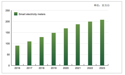 歐盟要求其成員國(guó)在 2022 年前要將電表全部更換為智能電表,在各國(guó)政府的推動(dòng)下,智能電表安裝數(shù)量自 2009 年開始呈現(xiàn)大幅增長(zhǎng)的態(tài)勢(shì);預(yù)計(jì)到 2030年,歐洲需要為電網(wǎng)升級(jí)改造投入約 5,000 億歐元。除丹麥、芬蘭和挪威等國(guó)的智能電表已逐步發(fā)展成型外,英國(guó)、法國(guó)、西班牙以及葡萄牙等國(guó)為滿足歐盟的能源發(fā)展目標(biāo)和環(huán)境政策要求,也制定出大規(guī)模智能電表市場(chǎng)的發(fā)展規(guī)劃。至 2023 年歐洲智能電表安裝總量累計(jì)將超過(guò) 2 億臺(tái),較2016 年的不足 1 億臺(tái)翻了一番多。歐洲智能電表市場(chǎng)即將進(jìn)入繁榮期,并通過(guò)再生能源和智能電網(wǎng)的雙重實(shí)施實(shí)現(xiàn)其“20-20-20”(能源使用效率上升 20%、二氧化碳排放減少 20%以及可再生能源使用達(dá)到 20%)的耗能目標(biāo)。