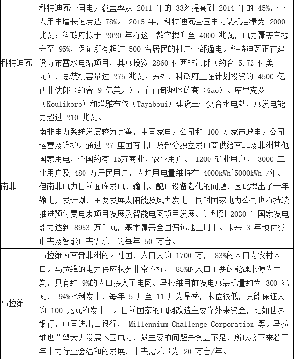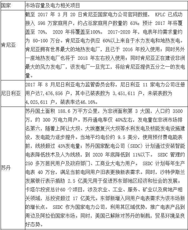 非洲各國(guó)家智能電表市場(chǎng)容量及電力相關(guān)項(xiàng)目如下: