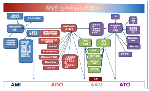 智能電網(wǎng)主要包括四個(gè)部分:高級(jí)測(cè)量架構(gòu)(AMI)、高級(jí)配電運(yùn)行(ADO)、高級(jí)輸電運(yùn)行(ATO)、高級(jí)資產(chǎn)管理(AAM)。技術(shù)上智能電網(wǎng)是通過(guò)以上四個(gè)部分之間的密切配合來(lái)實(shí)現(xiàn)的: AMI 同用戶建立通訊聯(lián)系并提供帶時(shí)標(biāo)的系統(tǒng)信息; ADO 使用 AMI 的通訊收集配電信息并改善運(yùn)行; ATO 使用 ADO 的信息改善運(yùn)行和改善輸電阻塞,并使 AMI 用戶可以訪問(wèn)市場(chǎng), AAM 使用 AMI、