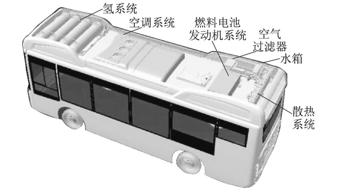 企業(yè)對氫燃料電池的安全管控細(xì)致入微,將安全隱患消滅在萌芽狀態(tài)。通過合理結(jié)構(gòu)設(shè)計(jì),燃料電池汽車具備多重容錯設(shè)定,保證氫燃料在不同危險(xiǎn)環(huán)境下,或切斷氫燃料輸出、或封閉與氧氣的混合。以福田歐輝 8.5 m 燃料電池大巴為例,電堆、空氣濾清器、空調(diào)散熱組件、高壓閥體以及氫燃料存儲鋼瓶等核心系統(tǒng)全部頂置,就是充分考慮了燃料電池能量轉(zhuǎn)化的特性而做出的結(jié)構(gòu)層面的安全設(shè)定(見圖 3)。