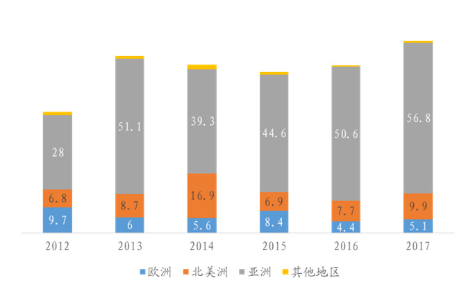 與此同時從全球各地區(qū)的出貨量來看,17年亞洲占據(jù)了全球約78%的燃料電池出貨量,達到5.7萬套。