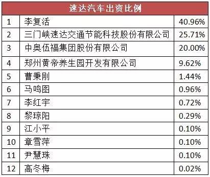 目前的工商信息顯示,速達(dá)汽車(chē)董事長(zhǎng)李復(fù)活持有超4成股權(quán)。而第二大股東三門(mén)峽速達(dá)交通節(jié)能科技股份有限公司(速達(dá)科技,新三板上市公司),也是李復(fù)活實(shí)際控制的公司,持有近四分之一股份。兩項(xiàng)相加,李復(fù)活持有近65%股份。