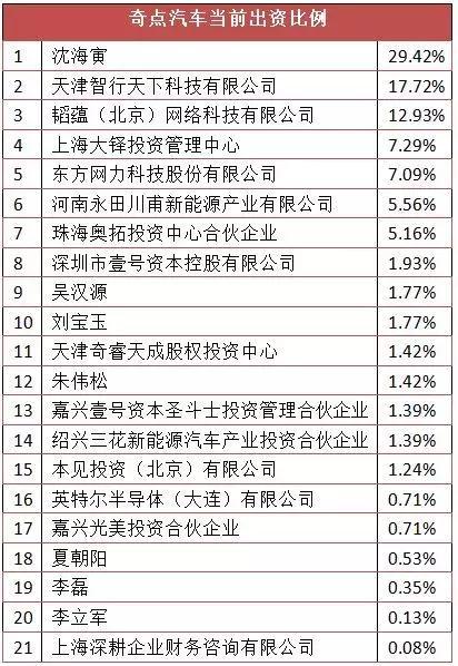 奇點(diǎn)汽車(chē)的主要股東方面,首先沈海寅和天津智行(沈海寅100%控股)分別持有29.42%和17.72%的股份。