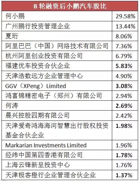 在A輪融資之前,小鵬汽車(chē)(廣州橙行智動(dòng)汽車(chē)科技有限公司)的資金以何小鵬等創(chuàng)始團(tuán)隊(duì)和天使投資為主。何小鵬也參與后續(xù)融資,因此他的股比還增長(zhǎng)了,達(dá)到43.6%之多。A1和A2輪開(kāi)始,諸多機(jī)構(gòu)加持小鵬汽車(chē),到了B輪,更有IDG等知名投資機(jī)構(gòu)現(xiàn)身。在B輪之后,如果小鵬在2018年春節(jié)前所說(shuō)的“會(huì)在今年過(guò)年前完成 50 億左右的融資”,此時(shí)總?cè)谫Y規(guī)模為50億左右。
