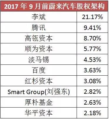 蔚來(lái)汽車(chē)公開(kāi)對(duì)外的公司是上海蔚來(lái)汽車(chē)有限公司,但該公司由設(shè)在開(kāi)曼群島的NIO NEXTEV LIMITED 100%控股,因此很難查到詳細(xì)投資信息。根據(jù)一份2017年9月的融資文件,蔚來(lái)汽車(chē)的出資方多且分散,經(jīng)過(guò)六七輪、總?cè)谫Y已經(jīng)超過(guò)150億元,至今股東超50家。