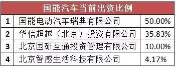 國(guó)能汽車(chē)(國(guó)能新能源汽車(chē)有限責(zé)任公司,下稱國(guó)能新能源)是國(guó)能汽車(chē)技術(shù)開(kāi)發(fā)有限責(zé)任公司100%控股公司。而國(guó)能汽車(chē)技術(shù)開(kāi)發(fā)公司,目前有四大股東,分別是國(guó)能瑞典、華信超越、國(guó)研互通和北京智感生活科技有限公司。