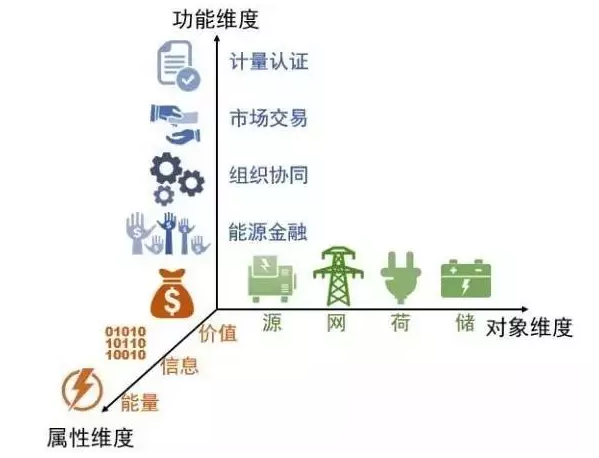 區(qū)塊鏈技術(shù)核心功能就是不依靠中心或者第三方機(jī)構(gòu),保障數(shù)據(jù)的真實可信,打破信任壁壘,極大降低了業(yè)務(wù)開展需要支付的信任成本,促進(jìn)業(yè)務(wù)的高效開展。區(qū)塊鏈的技術(shù)特征與能源互聯(lián)網(wǎng)的理念吻合,使區(qū)塊鏈未來有潛力成為能源互聯(lián)網(wǎng)中重要的技術(shù)解決方案之一。如圖1所示,區(qū)塊鏈技術(shù)在能源互聯(lián)網(wǎng)中的應(yīng)用可以從功能維度、對象維度和屬性維度等三個方面進(jìn)行歸納和分析。