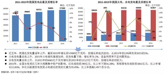 2011-2015年,我國發(fā)電總量逐年增加,但相對(duì)于增長穩(wěn)定的裝機(jī)容量,發(fā)電量的增長率呈現(xiàn)下降的趨勢(shì),且火電、水電發(fā)電量的增長率均有所波動(dòng)。