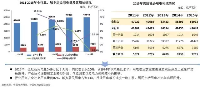 社會(huì)用電量逐年上升,行業(yè)用電量增速放緩,城鄉(xiāng)居民用電量2015年出現(xiàn)小幅回升。“十三五”是中國能源轉(zhuǎn)型的關(guān)鍵期,未來將進(jìn)一步提高電氣化水平,用電需求會(huì)穩(wěn)步增長,預(yù)期2020年全社會(huì)用電量將達(dá)到6.8-7.2萬億千瓦時(shí),年均增長3.6-4.8%。
