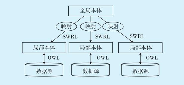目前,眾多專家學(xué)者在融合變電設(shè)備狀態(tài)監(jiān)測數(shù)據(jù)多源異構(gòu)問題方面進(jìn)行了有益的探索。針對輸變電設(shè)備全景信息多源、異構(gòu)特性不利于數(shù)據(jù)的高效整合和深度挖掘利用的問題,文獻(xiàn)[16]提出一種基于改進(jìn)混合本體的多源異構(gòu)數(shù)據(jù)聚合方法(見圖4),通過構(gòu)建數(shù)據(jù)源的局部本體以及全局本體,利用本體的語義特性解決數(shù)據(jù)聚合中關(guān)鍵性的語義異構(gòu)問題;采用網(wǎng)絡(luò)本體語言和語義網(wǎng)絡(luò)規(guī)則語言相結(jié)合的方式建立全局本體和局部本體之間的映射,實現(xiàn)映射的重用和共享[16]。