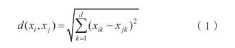 對于任意2個長度為d的向量xi=(xi1, xi2,…, xid)及xj=(xj1, xj2,…, xjd),其歐幾里得距離為:
