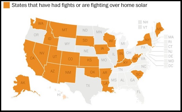 圖5:反對(duì)家用太陽能的美國各州(曾經(jīng)反對(duì)或現(xiàn)正抗拒家用太陽能的美國各州示意圖) (來源:The Washington Post)