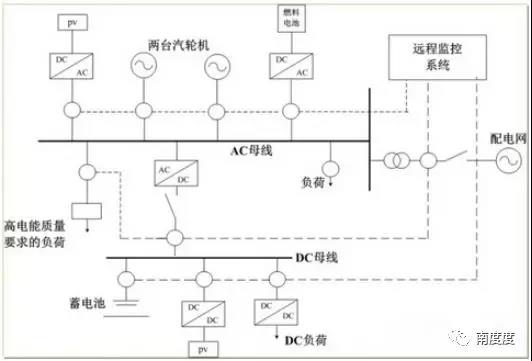 日本是亞洲研究和建設(shè)微電網(wǎng)較早的國家,自2003年開始,日本新能源與工業(yè)技術(shù)發(fā)展組織(NewEnergyandIndustrialTechnologyDevelopmentOrganization,NEDO)就協(xié)調(diào)高校、科研機(jī)構(gòu)和企業(yè)先后在八戶市、愛知縣、京都市和仙臺市等多地區(qū)建設(shè)了微電網(wǎng)示范工程,研究、驗(yàn)證了一批微電網(wǎng)關(guān)鍵技術(shù),其發(fā)展目標(biāo)主要定位于能源供給多樣化、減少污染、滿足用戶的個性化電力需求。日本采用的微電網(wǎng)結(jié)構(gòu)如圖所示
