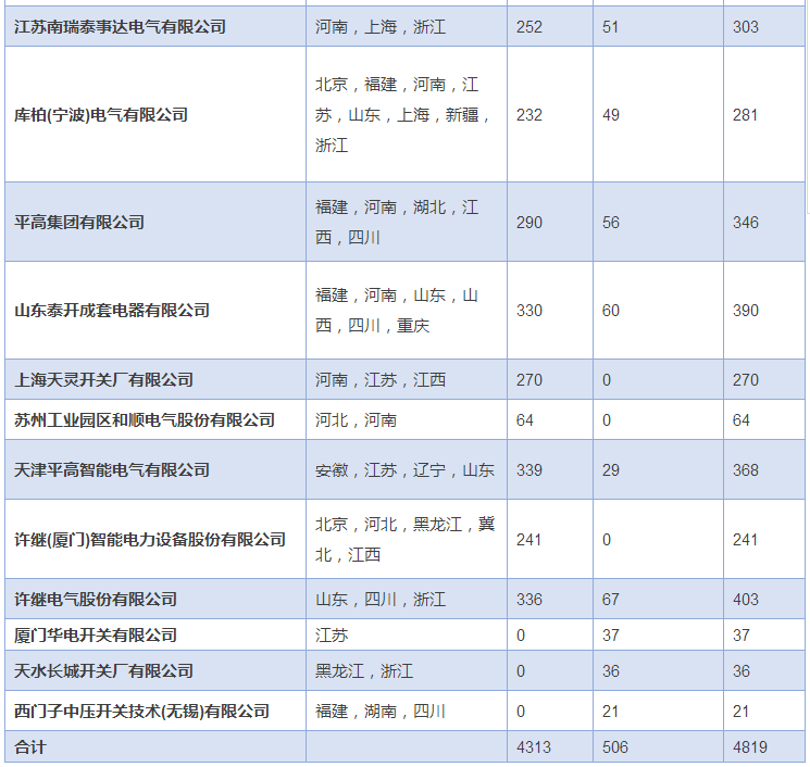 從中標企業(yè)來看,本次開關柜招標,10kV設備電壓等級開關柜招標共有17 家企業(yè)中標。天津平高智能電氣有限公司中標339 臺,排名第一,份額7.86%。許繼電氣股份有限公司中標336 臺,份額為7.79%。山東泰開成套電器有限公司中標330臺,排名第三,份額為7.65%。