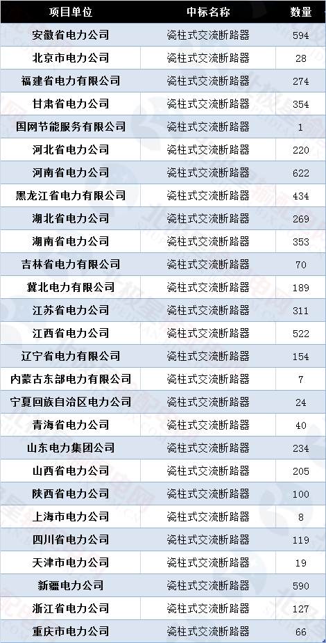 國家電網(wǎng)公司輸變電項目變電設(shè)備招標(biāo)1-6批次瓷柱式交流斷路器招標(biāo)情況
