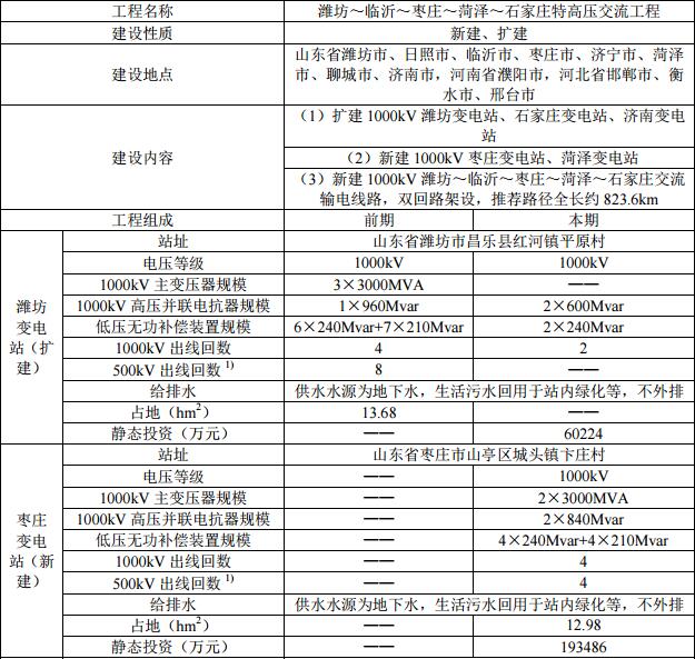 本工程建設(shè)內(nèi)容包括:新建 1000kV 棗莊、菏澤變電站,擴(kuò)建 1000kV 濰坊、石家莊、濟(jì)南變電站,新建濰坊~臨沂~棗莊~菏澤~石家莊雙回 1000kV 交流輸電線路(以下簡稱“濰坊~臨沂~棗莊~菏澤~石家莊特高壓交流線路”)約 2×823.6km(含黃河大跨越 2×2.7km)。