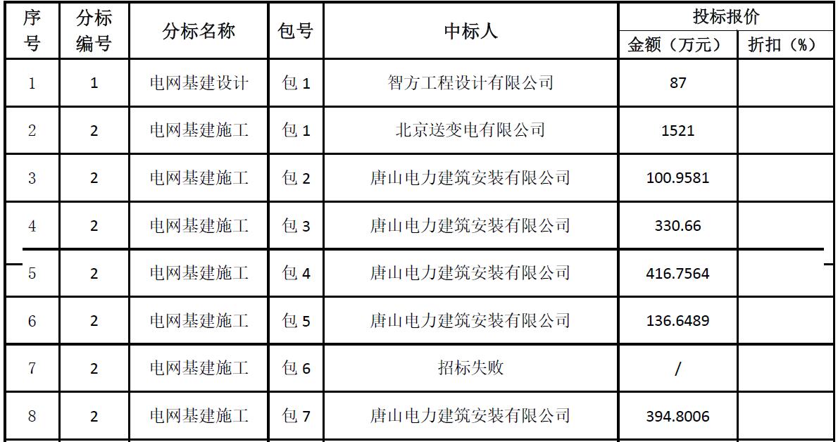 國網(wǎng)冀北電力有限公司2018年第一次電網(wǎng)工程及服務(wù)招標(biāo)采購項目的中標(biāo)候選人公示已結(jié)束,現(xiàn)將中標(biāo)結(jié)果公告如下:國網(wǎng)冀北招標(biāo)有限公司2018年