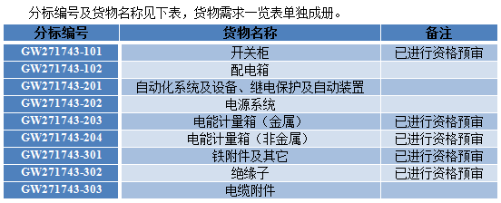 本次招標項目中GW271742-101;203;204;301;302分標已完成資格預(yù)審工作,通過資格預(yù)審的申請人(依據(jù)招標人招投標交易平臺信息系統(tǒng)http://ecp.sgcc.com.cn公共信息中關(guān)于“國網(wǎng)甘肅省電力公司2017年10kV及以下配網(wǎng)物資類招標資格預(yù)審 結(jié)果公告”)方有資格參加相應(yīng)分標的投標;其余分標采用公開招標方式邀請有興趣的合格投標人(以下簡稱“投標人”)。