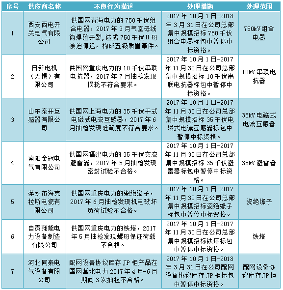 國家電網公司通報2017年9月供應商不良行為處理情況