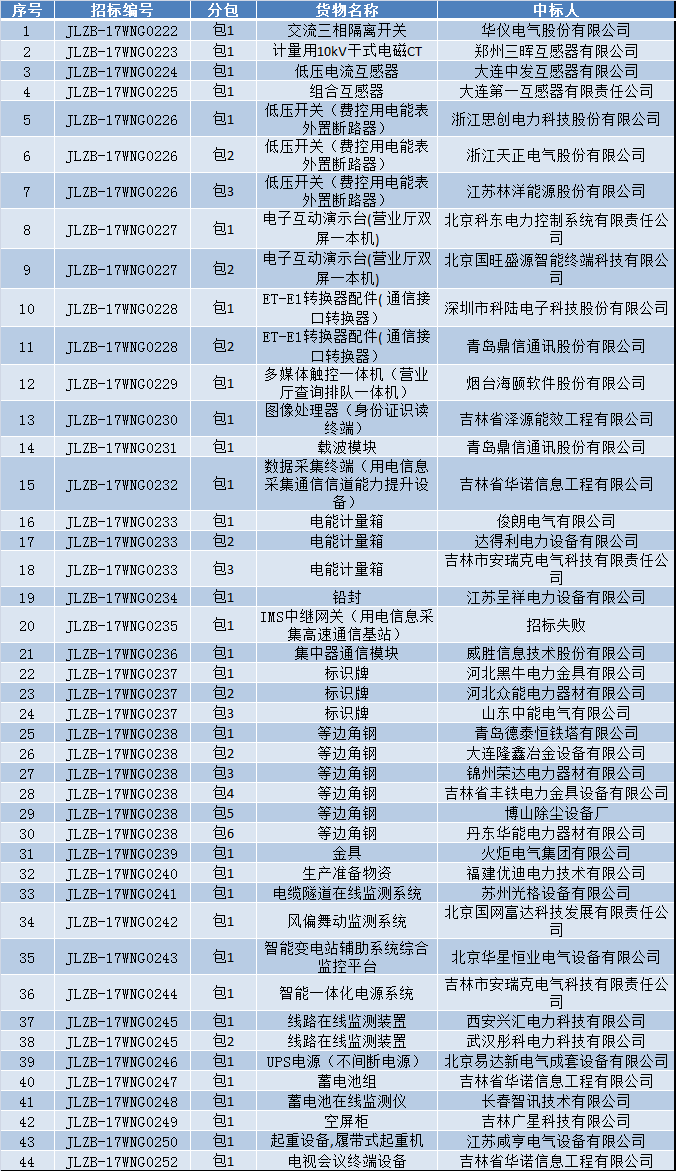 國網(wǎng)吉林省電力有限公司2017年第五批物資集中規(guī)模招標采購中標公告(招標編號:JLZB-17WNG0222-0252)