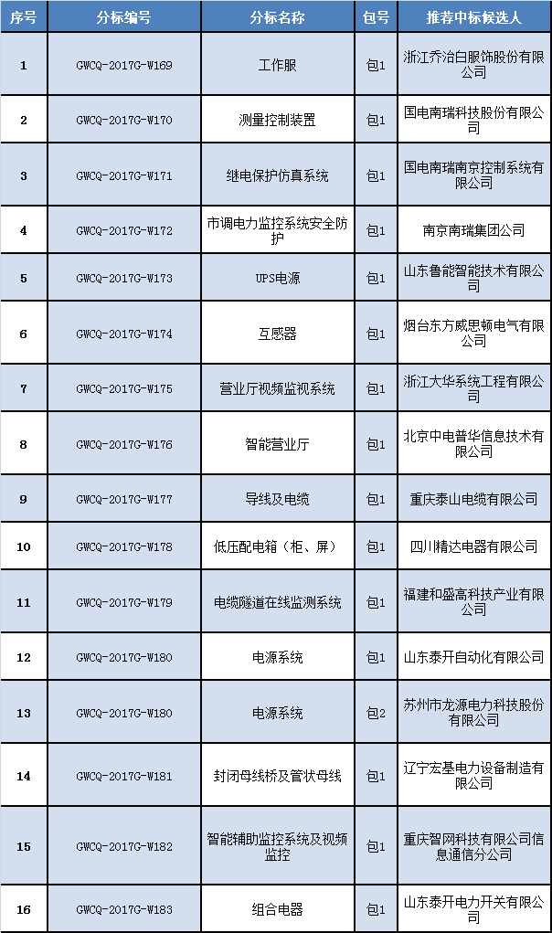 國(guó)網(wǎng)重慶2017年第四批物資集中招標(biāo)中標(biāo)結(jié)果