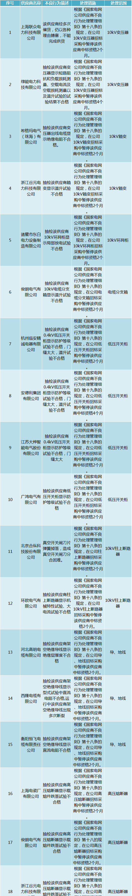 為促進(jìn)供應(yīng)商誠(chéng)信履約,保證產(chǎn)品質(zhì)量,確保電網(wǎng)建設(shè)順利進(jìn)行及安全可靠供電,依據(jù)《國(guó)家電網(wǎng)公司供應(yīng)商不良行為處理管理細(xì)則》(以下簡(jiǎn)稱(chēng)《細(xì)則》)的有關(guān)規(guī)定,對(duì)出現(xiàn)重大產(chǎn)品質(zhì)量問(wèn)題、履約不誠(chéng)信等問(wèn)題的供應(yīng)商進(jìn)行了處理。本次處理涉及10kv變壓器、高壓熔斷器等物資,具體處理情況如下: