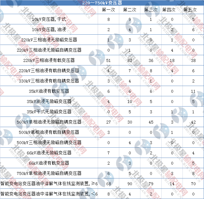 同樣,在220KV-750KV變壓器招標情況中,從單一的招標數(shù)量來看,五次招標數(shù)量整體處在前兩位的分別是:220kV三相油浸有載變壓器和500kV單相油浸無勵磁自耦變壓器。此次,在220KV-750KV變壓器招標情況中我們還統(tǒng)計了智能變電站變壓器油中溶解氣體在線監(jiān)測裝置,相關數(shù)據(jù)供大家參考。