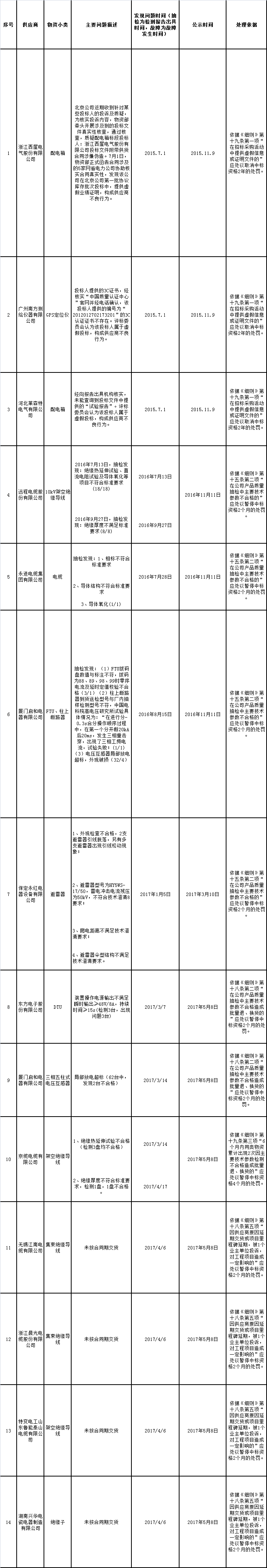 國網(wǎng)關于供應商不良行為處理情況的通報(2017年11月)