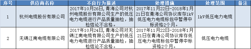 國網(wǎng)青海省電力公司2017年11月供應商不良行為處理情況公示