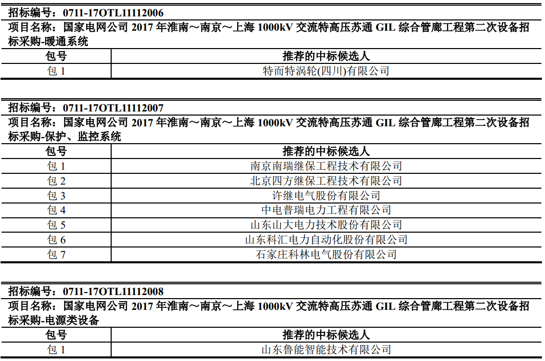 國網(wǎng)2017年淮南~南京~上海1000kV交流特高壓蘇通GIL綜合管廊工程第二次設備招標中標侯選人