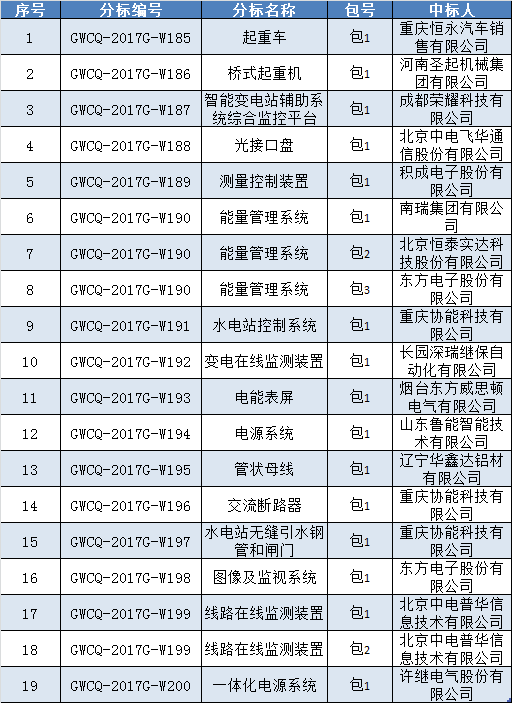 國網(wǎng)(重慶)2017年第五批物資集中招標中標結(jié)果