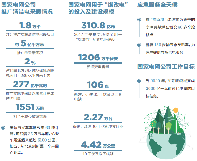 為此,國家電網(wǎng)公司成立了各級專項工作組,具體組織實施“煤改電”工作。為了保障“煤改電”負(fù)荷用電要求,各級供電企根據(jù)地方政府確定的改造范圍和規(guī)模,評估電網(wǎng)供電能力,調(diào)整電網(wǎng)建設(shè)年度計劃。2017 年,國家電網(wǎng)公司安排 310.8 億元專項資金,用于“煤改電”配套電網(wǎng)建設(shè),新建、擴(kuò)建 106 座 35 千伏及以上變電站,新增變電容量 1206 萬千伏安;新建、改造 10 千伏配電變壓器 2.27 萬臺,10 千伏及以下線路 4.42 萬公里。為確保配套電網(wǎng)建設(shè)進(jìn)度與政府“煤改電”工作有效銜接,保障按時供電,國家電網(wǎng)公司強(qiáng)化內(nèi)部協(xié)同,建立“日管控、周調(diào)度、關(guān)鍵節(jié)點重點督導(dǎo)”等工作制度,以村為單位細(xì)化工程施工計劃,落實工作責(zé)任。截至 9月底,累計完成京津冀及周邊地區(qū)居民“煤改電”用戶 175 萬戶、5763 個村的改造任務(wù),供暖面積超過 1 億平方米。