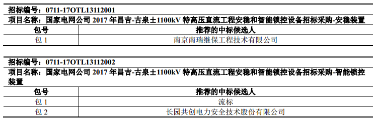 國家電網(wǎng)公司2017年昌吉-古泉±1100kV特高壓直流工程安穩(wěn)和智能鎖控設備招標采購(招標編號:0711-17OTL13112001—12002)評標工作已經(jīng)結(jié)束。依據(jù)《中華人民共和國招標投標法實施條例》第五十三條和第五十四條的規(guī)定,現(xiàn)將評標委員會推薦的中標候選人予以公示,公示期3天。投標人或者其他利害關系人對依法必須進行招標的項目的評標結(jié)果有異議的,應當在中標候選人公示期間以書面形式(傳真)向招標人提出。